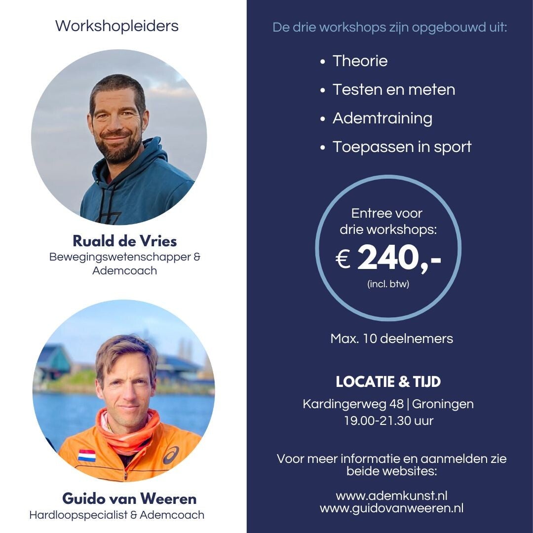 In samenwerking met hardloopspecialist en ademcoach Guido van Weeren organiseert Ademkunst 'De complete sporter', een serie van drie workshops voor duursporters, waarin de kracht van ademhaling centraal staat.